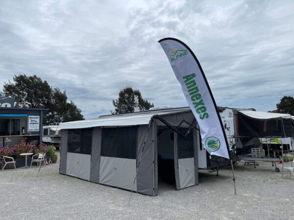 Alpine Annexes has developed a versatile ½ Mesh / ½ Canvas Annexe, available for both electric and roll-out awnings. This design is ideal for RVs with a gas-vented fridge located on the annexe side, providing safe airflow while still allowing for a fully enclosed canvas section — perfect for sleeping or weather-protected storage — alongside a shaded living area.